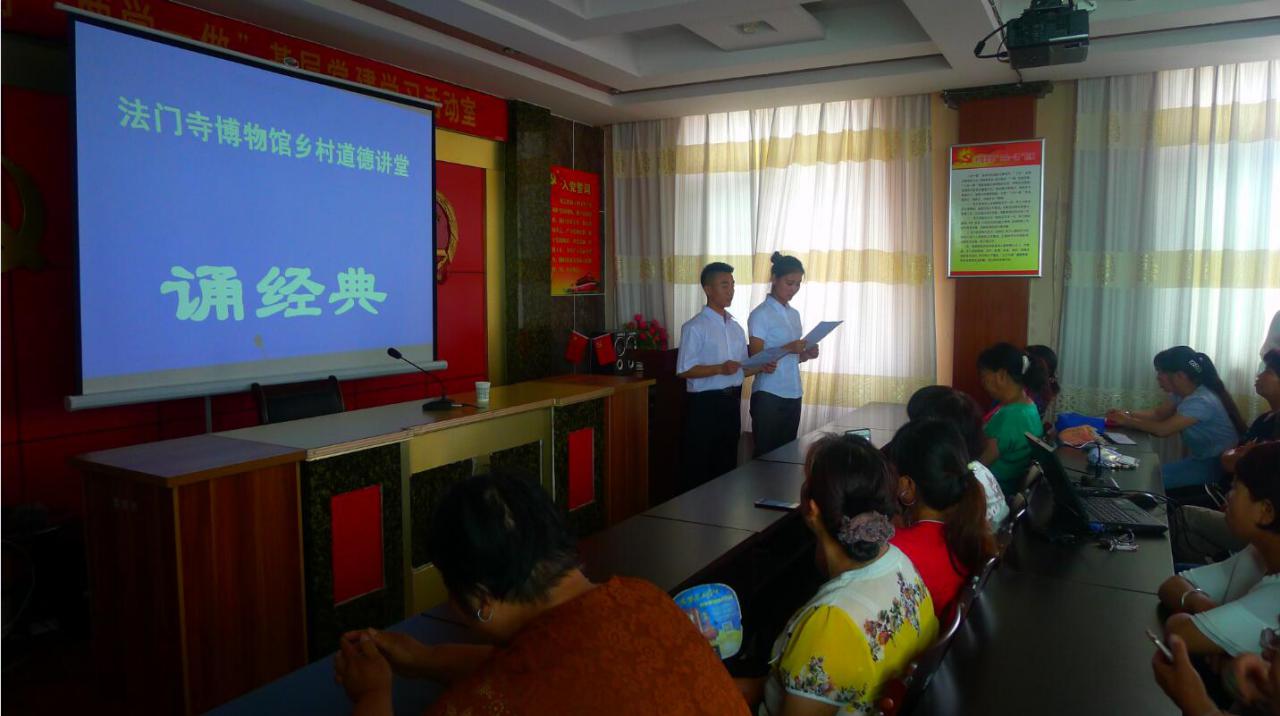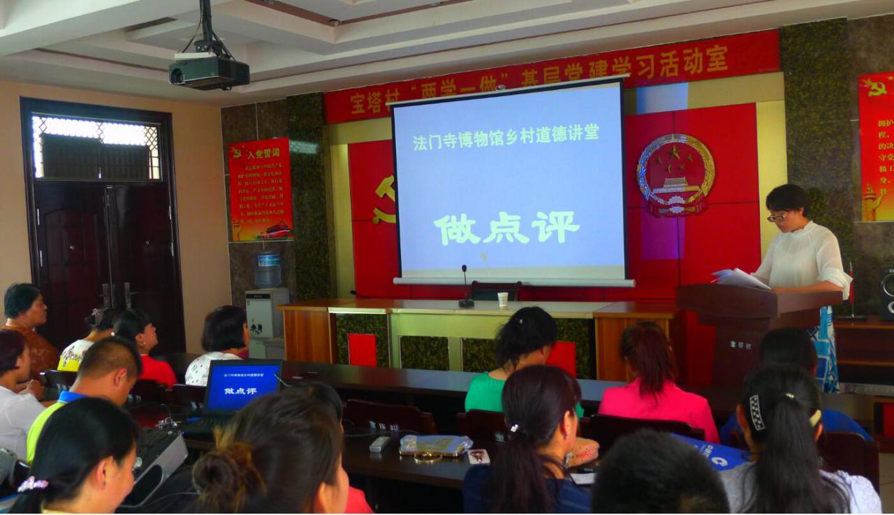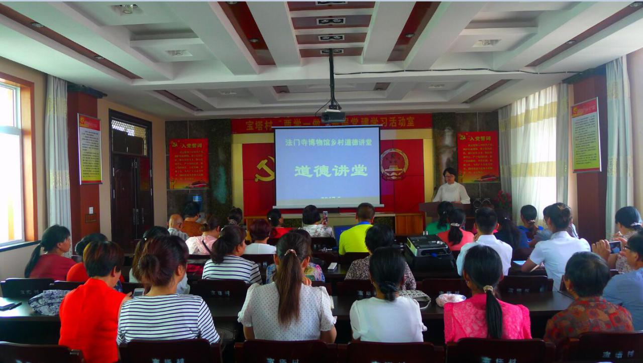 为推进美丽乡村,文明家园共建活动,引导乡村群众提升道德素养,彰显文明单位风采,6月26日上午,法门寺博物馆举办的乡村道德讲堂在扶风县法门镇宝塔村三楼会议室开讲。这是法门寺博物馆把建设“美丽乡村”的一项重要内容“道德讲堂”第二次搬到百姓家门口、推进文化建设的一个缩影。活动以“尊老爱幼”为教育主题,旨在让广大村民群众学习和践行道德模范精神,树立道德意识,传承中华优秀美德,着力为老年人安享晚年,小孩健康成长营造良好环境。