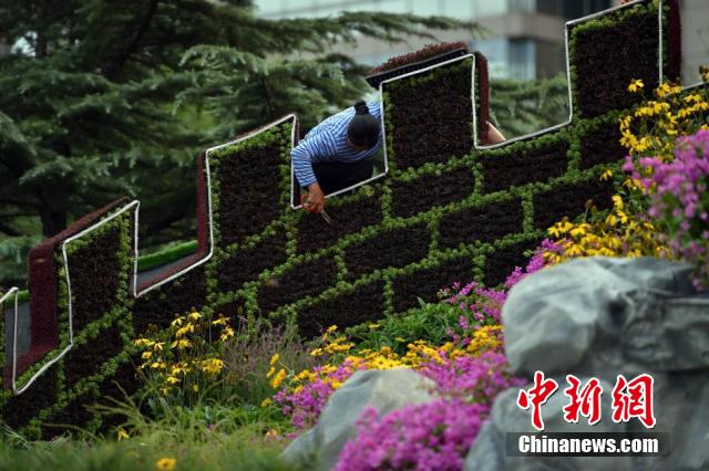 天安门阅兵观礼台与“长城”主题花坛渐露真容