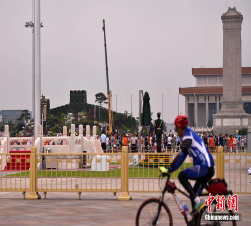近日,为迎接将于9月3日举行的“纪念中国人民抗日战争胜利七十周年”阅兵活动,天安门广场搭建起的临时观礼台已逐渐露出“真容”。广场中心花坛以“长城”为主题,位于英雄纪念碑的北侧,分东西各一组,单组东西长60米,南北宽25米。据悉,这是继2008年奥运会后,天安门广场再次使用植物花卉,搭建自然山水花坛。花坛以雄伟巍峨的长城为主景,配以挺拔的造型油松,通过丰富多彩的植物花卉及白鸽、年号、景石等素材,搭建出祖国的壮丽山水画卷美景。