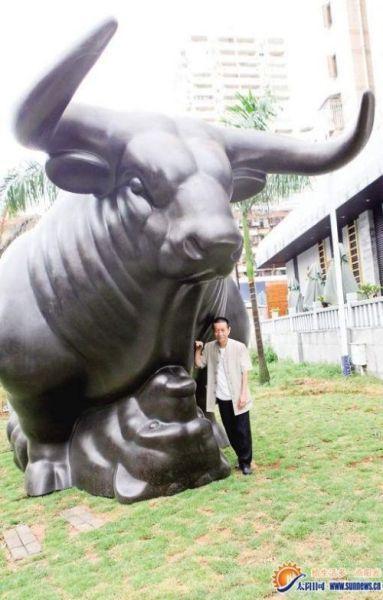 新雕塑吸引了不少市民驻足围观,雕塑是一头牛身下压着一头熊,让不少人联想到了股市。记者了解到,此雕塑主人为知名收藏家蔡铭超。蔡铭超向记者证实,这个雕塑确与股市有关。他表示,此雕塑或为世界最大铜牛雕塑,下一步可能申请吉尼斯纪录。