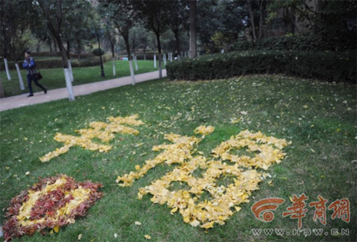 “麦迪儿的笔”说,这是她在同学小区拍到的,觉得保洁员很有心,自己有些感动就发到微博上。随后华商报记者在西安曲江找到这个小区,也找到这些漂亮的图案,从图案能看出拼图者的用心,每种图案或者文字都用不同颜色的落叶拼制勾边。