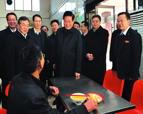 赵正永首先来到煤矿职工餐厅,察看饭菜价格、服务质量和卫生状况,询问职工的生产生活,要求下大气力做好保障工作,不断改善职工生活条件。在调度指挥中心,赵正永了解煤炭产量、市场销售和生产成本等情况,观看井下视频监控和瓦斯监测设备,叮嘱有关同志要高度警惕瓦斯泄漏,进一步加强安全生产。