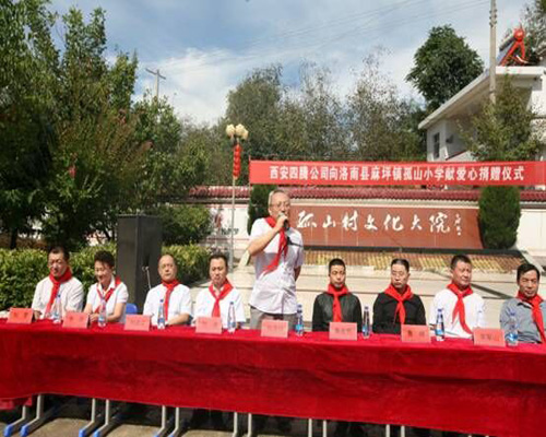 日前,西安四腾公司向洛南县麻坪镇孤山小学献爱心捐赠仪式在孤山小学举行。四腾公司捐资10万元人民币,为洛南县麻坪镇孤山小学和洛南县石坡镇中银商树希望小学购置了桌椅等教学设施。西安四腾公司党总支书记白浩强等二十多位党员干部、陕西省工商联副主席宋永华、中华工商时报陕西记者站站长鲁峰、鲁宏伟、洛南县孤山镇人大主席、镇长及孤山小学等300多人参加捐赠仪式。