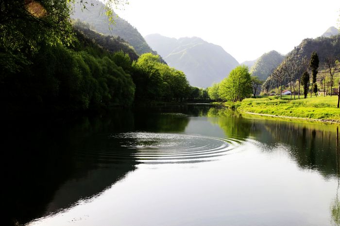 漾河由巴山而出,巴山峰峦平缓、柔美秀丽,晶莹的水珠在绿茸茸的苔藓下面集结成小小溪流,从山的怀抱里轻轻流淌,一路穿越森林,举目望着被树枝分割的蓝天,灵动的心卷着一片片落叶,从石间落下嘀哒的声音是世间最美丽的音符,它集结了森林的气息,走过的寸寸土地都有绿色的精灵在舞蹈。