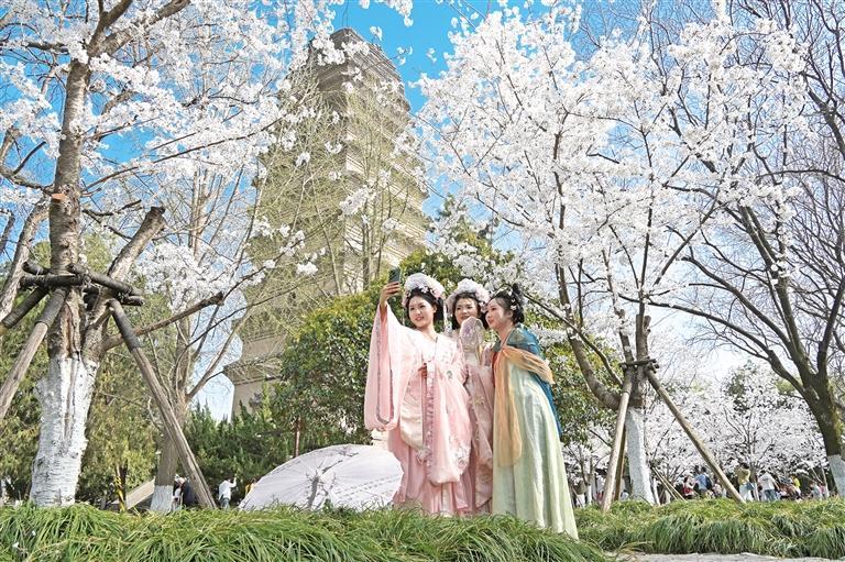 2025西安赏花季活动从3月持续到5月,市民游客可在花海中体验“长安春色入画来”的诗意浪漫。图为3月23日,市民游客在西安博物院游览。 杜玮摄