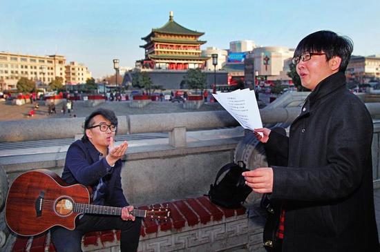 昨天,两人在微信朋友圈将这首歌首次发布,瞬间好评如潮。在钟鼓楼广场,两人伴着冬天的暖阳,再次哼唱起来。